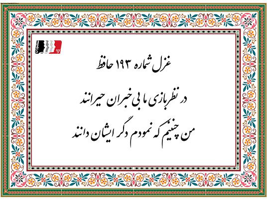 غزل 193 حافظ با در نظربازی ما بیخبران حیرانند آغاز می شود. وزن غزل در نظربازی ما ، فاعلاتن فعلاتن فعلاتن فع لان (بحر رمل مثمن مخبون اصلم مسبغ) می باشد. در ادامه می توانید متن کامل غزل و همچنین معنی لغات و شرح و تفسیر ابیات را مشاهده کنید. در شرح و تفسیر از کتاب شرح سودی بوسنوی ، شرح حافظ دکتر خطیب رهبر، دکتر عبدالحسین جلالیان و شرح شوق دکتر حمیدیان بهره گرفته شده است. ضمنا می توانید از فایل pdf متن، معنی و تفسیر غزل 193 حافظ استفاده کنید.