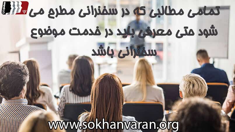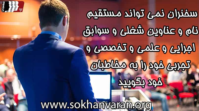 بنابراین شما به عنوان سخنران نمی توانید مستقیم نام و عناوین شغلی و سوابق اجرایی و علمی و تخصصی و تجربی خود را به مخاطبان خود بگویید. علت آن است که آکادمی فن بیان در سخنرانی و سخنوری خود، هر مضمونی که می خواهند بیان کنند باید به آن موضوعیت ببخشند و در قالب موضوع به مضمون بپردازند و نمی توانند رک و مستقیم و بدون ارتباط با موضوع سخنرانی، کلام و سخنی را بر زبان بیاورند.