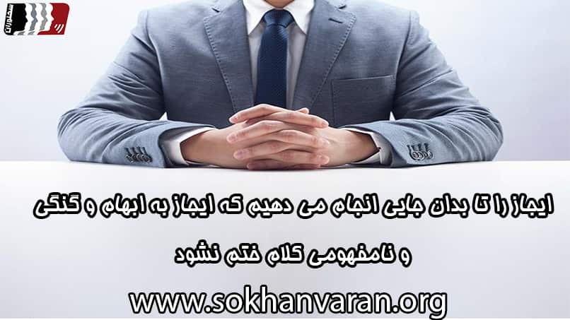 ایجاز و اطناب حد و حدودی دارند که اگر رعایت نشود به کلام و بیان آکادمی فن بیان ضربه می زند. ایجاز را تا بدان جایی انجام می دهیم که ایجاز به ابهام و گنگی و نامفهومی کلام ختم نشود که اگر کلام نامفهوم گردید هم تشخص سخنور به زیر سوال می رود و هم مخاطب از همراهی کردن قطار سخن باز می ماند.