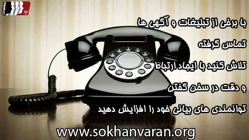 حتی اگر هیچ کدام از این فرصت ها را ندارید می توانید از نیازمندی های روزنامه ها استفاده کنید. با برخی از تبلیغات و آگهی ها تماس گرفته، تلاش کنید با ایجاد ارتباط و دقت در سخن گفتن، توانمندی های بیانی خود را افزایش دهید. کاملا طبیعی است که برای ورزیدگی در هر کاری باید آن را بر اساس آگاهی و دانش، فراوان انجام داد و تکرار کرد، به عبارت دیگر کار نکو کردن از پر کردن است.