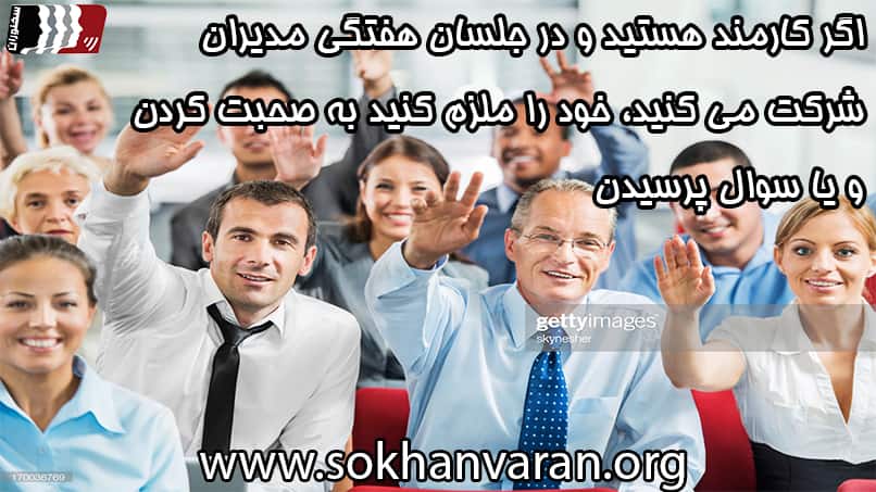اگر کارمند هستید و در جلسه هفتگی مدیران شرکت میکنید , خود را ملزم کنید به صحبت کردن یا سوال پرسیدن