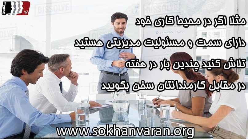 اگر در محیط کاری خود دارای سمت و مسئولیت مدیریتی هستید تلاش کنید چندین بار در هفته در مقابل کارمندانتان سخن بگویید