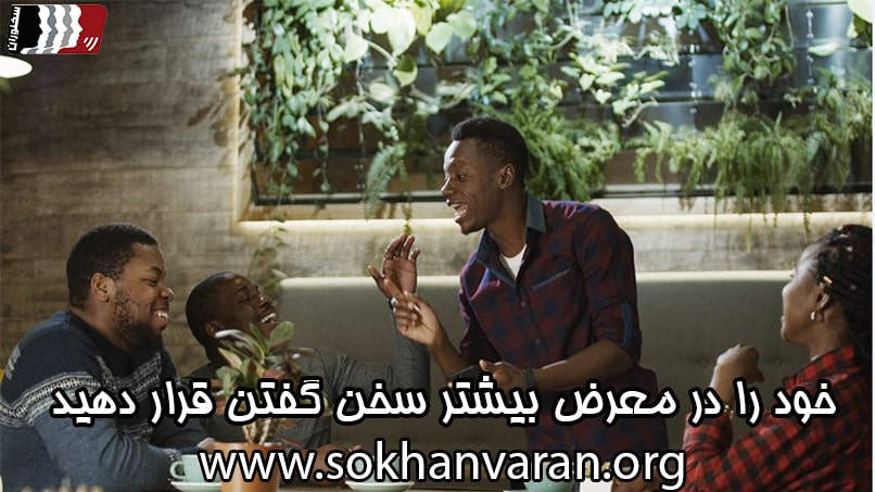تمرین دیگر که خود به گونه ای تکمیل کننده تمرین قبلی است، این است که خود را در معرض بیشتر سخن گفتن قرار دهید. شما باید از هر فرصتی برای صحبت کردن استفاده کنید چه کوتاه و چه بلند.