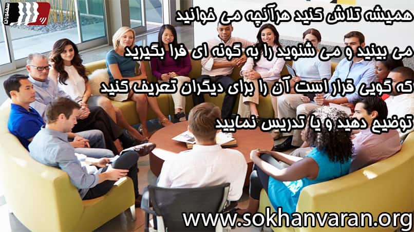 برای آنکه نحوه گفتار و بیان شما تقویت شود همیشه تلاش کنید هرآنچه می خوانید ، می بینید و می شنوید را به گونه ای فرا بگیرید که گویی قرار است آن را برای دیگران تعریف کنید، توضیح دهید و یا تدریس نمایید.