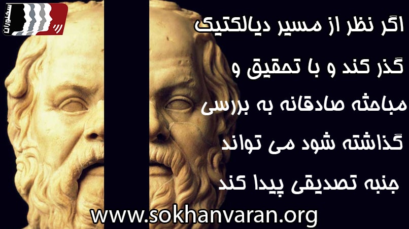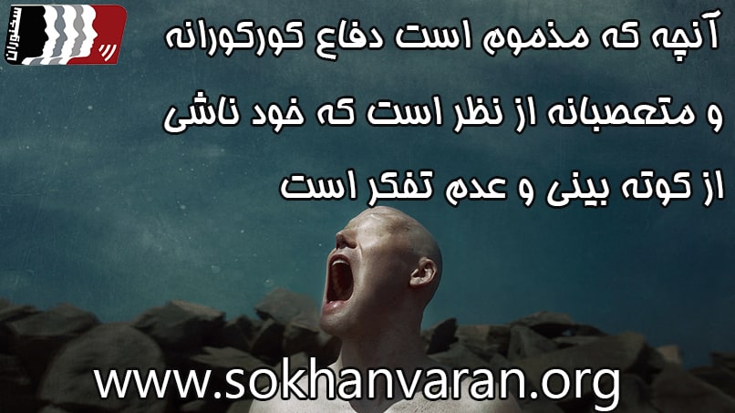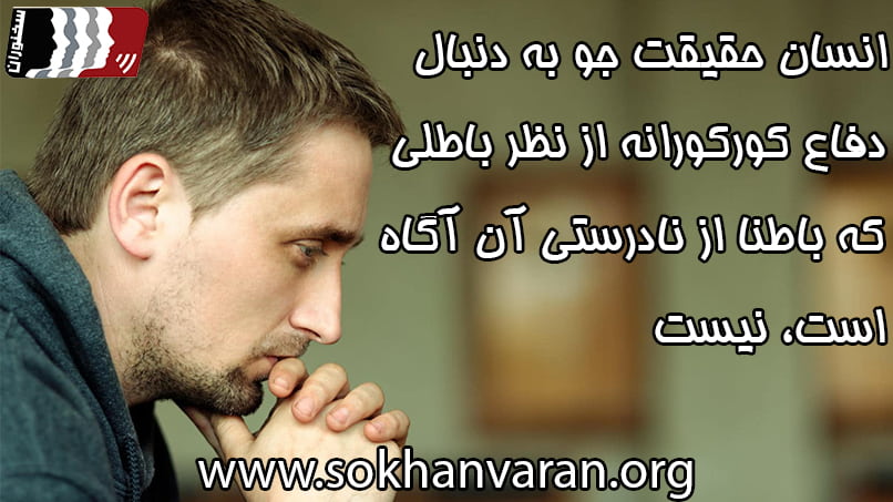 دفاع کورکورانه و متعصبانه و کوته بینانه آن است که كسي بداند آن چه را که از آن دفاع مي كند، كذب است و آن چه را که رد مي كند صدق است. اینجا دیگر فرد از مرز انسانیت خارج شده است و سفسطه می کند. اما در حالتی که من هم نمی دانم که صدق و کذب کدام است، و بر نظرم ابرام و پافشاری می کنم و با استفاده از فن سخنرانی و اصول مناظره و مجادله سعی در اثبات آن دارم، این دیگر عین حقیقت جویی است.