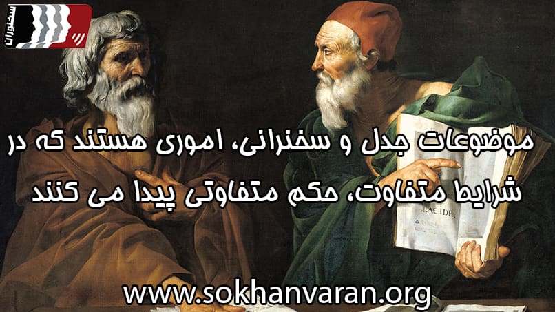 ما نمي توانيم حكم دهيم كه دشمني امر درست يا غلطي است، مجازات درست يا لزوما غلط است و يا مداومت در دوستي و مودت درست يا نادرست است كه هر وجه و طرف اين موارد پر از تناقض و امور سلبي و ايجابي است و اتفاقا چنين مسائلي موضوعات جدل است، يعني دقيقا همان مواردي كه موضوعات سخنرانی و سخنوري است. این ها مسائلي هستند كه مي توان مورد مشورت قرار داد. اموري هستند كه متناسب با شرايط متفاوت، حكم متفاوتی پیدا می کنند.