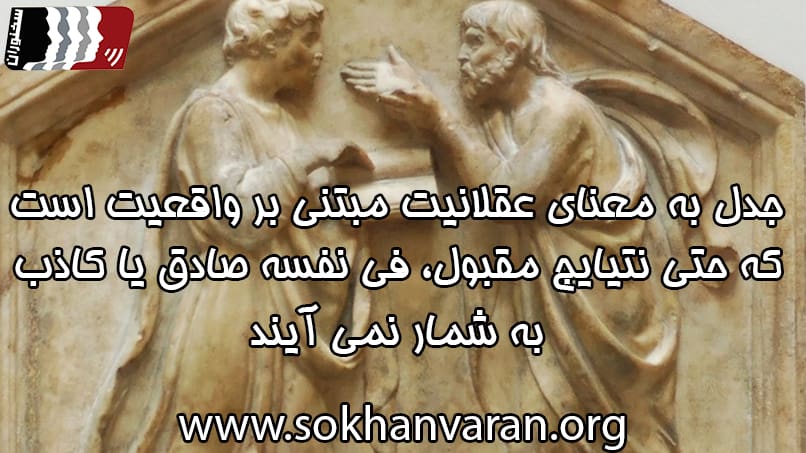 اين كه من بر اساس الزامي فردي به نظري ميرسم، امري واضح است و ضرورتي تعيين نموده است كه من به اين نظر برسم، پس قطعا بايد آن را در بحثي جانانه تبديل به نتيجه كنم. منظور ارسطو از منطق، رسيدن به رويه اي جهت وصول به نتايج صادق است كه متفكر از خطاهاي ذهني برحذر باشد تا به نتيجه درست دست يابد. اما مناظره و مجادله را به مثابه رسيدن به نتايجي كه مقبول مي افتند و نه لزوما درست، معنا مي كنيم. جدل به معناي عقلانيت مبتني بر واقعيت است كه حتي نتايج مقبول، في نفسه صادق يا كاذب به شمار نمي آيند.